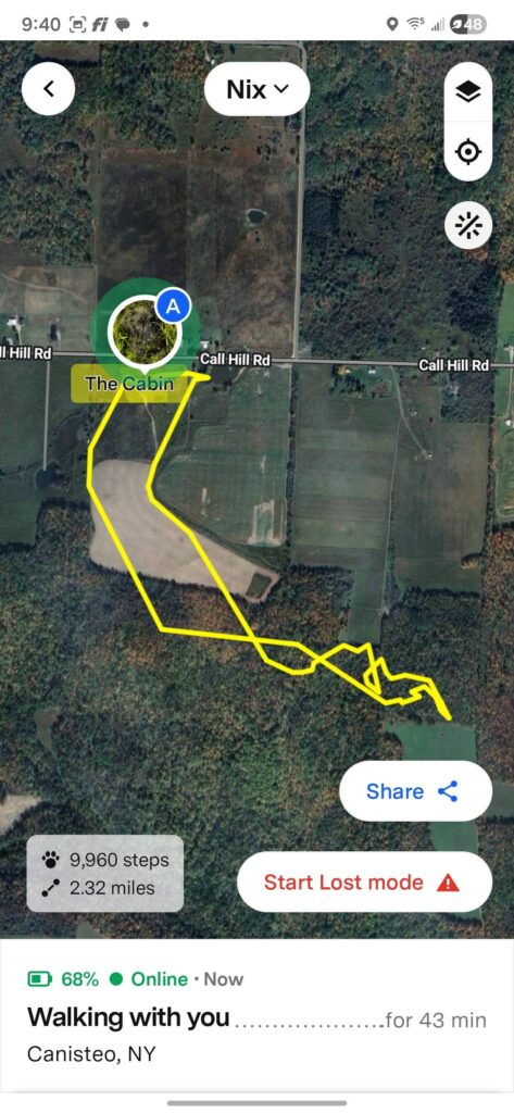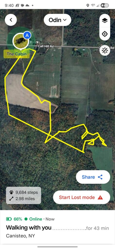 While I could watch Odin and Nix (on the 3+) move in real-time, Pandora is wearing the F2 and hers obviously isn't as accurate and slow to update. The 3+ also tracked down into the gully further which turns into a dead zone in the woods.